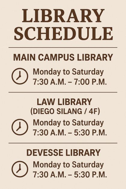 The Saint Louis University (SLU) Libraries expanded in the six-story Msgr. Charles Vath Building at the Bonifacio Campus with satellite libraries: the Devesse Library at the Maryheights Campus, and the Law Library at the Diego Silang Building.