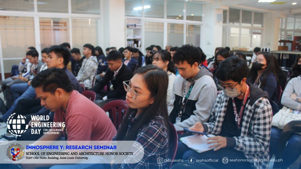The School of Engineering and Architecture Honor Society (SEAHS) conducted a remarkable event, InnoSphere Y: Research Seminar, as a concurrent activity for World Engineering Day for Sustainable Development on 4 March 2024, held at the SIRIB Center, Otto Hahn Building, SLU Main Campus. With a notable attendance of 95 registrants plus walk-in participants, the seminar featured two distinguished resource speakers who shared insights into various aspects of engineering research.
