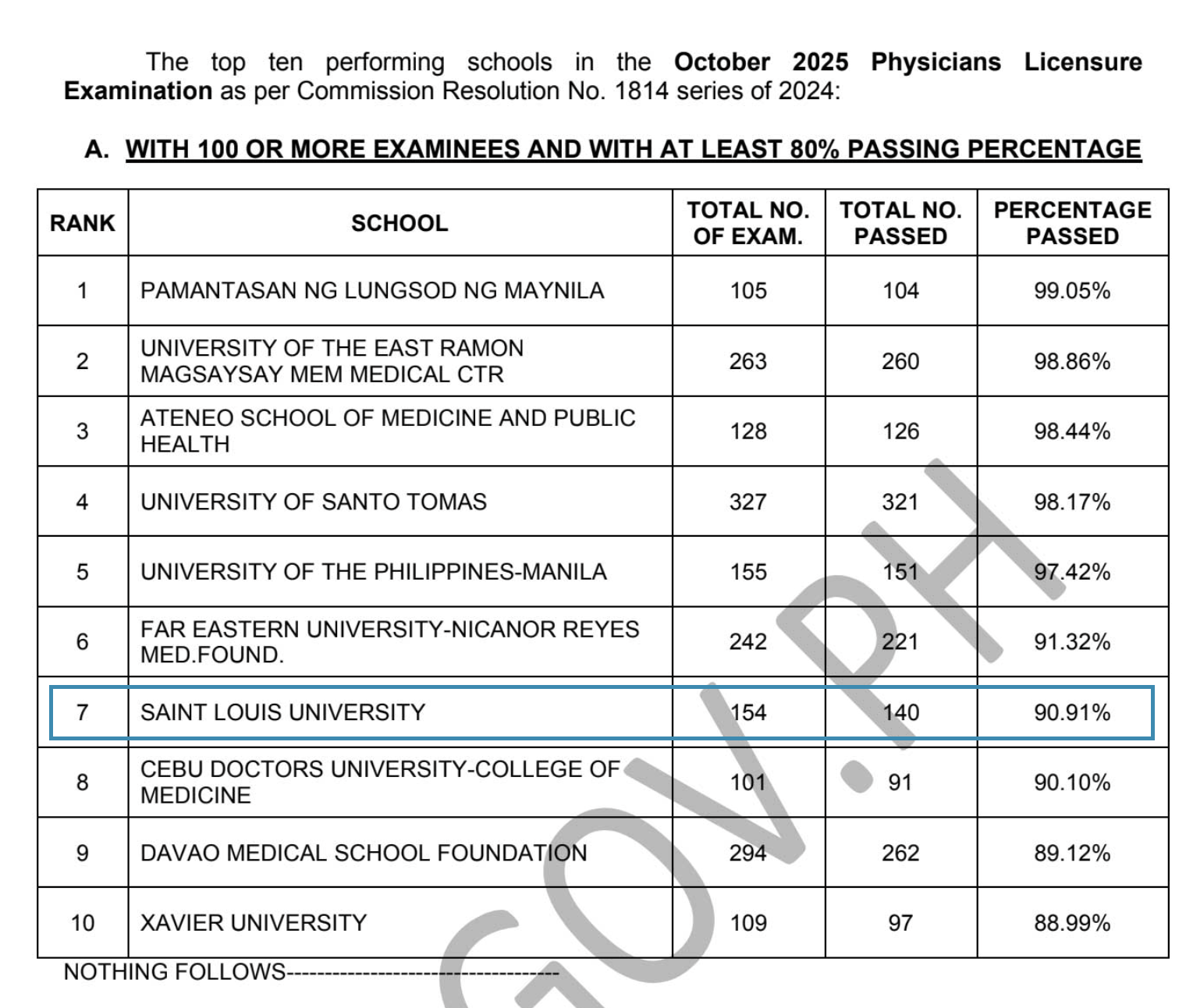 Saint Louis University (SLU), with a 90.91% passing rate, locked Rank 7 among the Top-Performing Schools nationwide among those with 100 or more examinees and with at least 80% passing percentage in the October 2025 Physicians Licensure Exams (PLE). This was announced on 16 October 2025 by the Professional Regulation Commission (PRC).