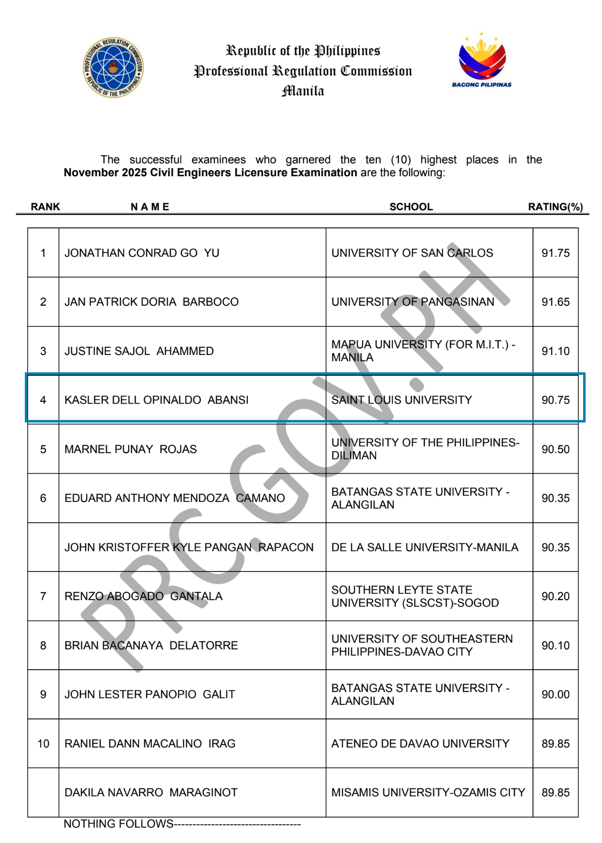 On 29 November 2025, the Professional Regulation Commission (PRC) announced that 4,268 out of 14,043 (30.39%) passed the November 2025 Civil Engineers Licensure Examination (CELE).