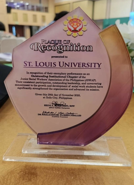 Saint Louis University (SLU) was awarded as Outstanding Institutional Chapter of the Junior Social Workers’ Association of the Philippines (JSWAP) during the 51st Biennial Convention of the National Association for Social Work Education, Inc. (NASWEI), held on 26-28 November 2025, at the Grand Xing Imperial Hotel in Iloilo City. This distinction reflects SLU’s commitment to student leadership, ethical practice, and community engagement, embodying the values of CICM advocacy, CEAP’s JEEPGY, and the sustainability goals of Laudato Si’.