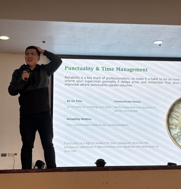 The session further explored networking and workplace culture, highlighting the importance of respect and gratitude across all levels of an organization. Mr. Dela Cruz shared a Filipino value to illustrate this point: “Kung hindi ka marunong lumingon sa pinanggalingan mo, hindi ka makakarating sa paroroonan mo,” reminding students that humility and appreciation strengthen professional relationships.