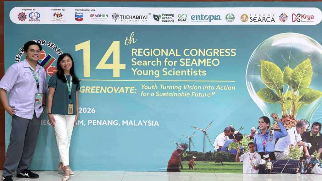 GEORGETOWN, PENANG, MALAYSIA – Saint Louis University (SLU), through Lara Annika Paula E. Namoca, an SLU Basic Education School (BEdS) Senior High School student, together with her adviser John Michael A. Guerzon, represented the University and the country at the 14th Regional Congress – SEAMEO Search for Young Scientists (SSYS) 2026 held on 9-12 February 2026, in Georgetown, Penang, Malaysia. Anchored on this year’s theme, “GREENOVATE: Youth Turning Vision into Action for a Sustainable Future,” the Congress emphasized innovation-driven solutions to environmental and societal challenges.