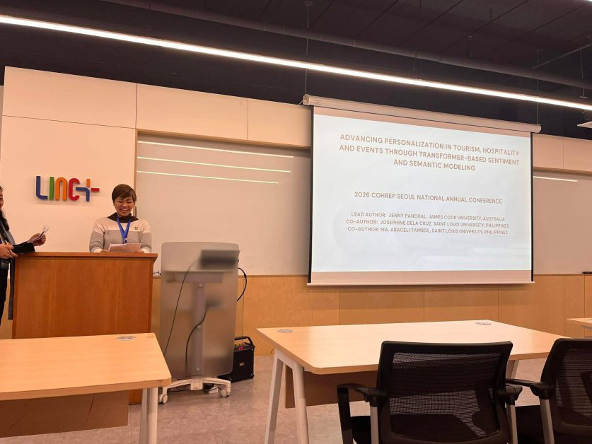 One of the highlights was a stand-up research presentation by Prof. Maria Araceli Diaz-Tambol, a Hospitality and Tourism Management (HTM) faculty member of SLU’s School of Accountancy, Management, Computing and Information Studies (SAMCIS). Her paper, “Advancing Personalization in Tourism, Hospitality and Events (THE) through Transformer-based Sentiment and Semantic Modelling,” examined the use of advanced artificial intelligence and transformer-based models in enhancing personalized experiences across tourism, hospitality, and event sectors. The study was co-authored with Jenny Panchal, PhD, a senior tourism lecturer and tourism research collaborator of James Cook University, Australia, and Josephine Dela Cruz, PhD, of the Computer Science (CS) Department of SLU, demonstrating meaningful international and inter-institutional research collaboration.