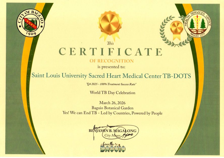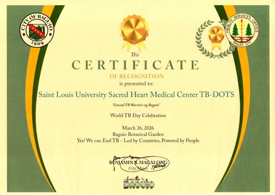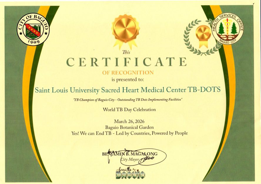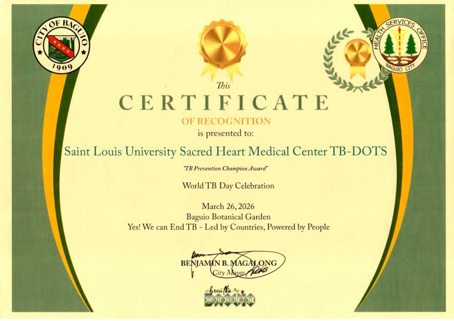 The Saint Louis University Sacred Heart Medical Heart Center (SHMC) TB – Directly Observed Treatment, Short-course (TB-DOTS) was awarded for its TB prevention initiatives on 26 March 2026 at the Baguio Botanical Garden.