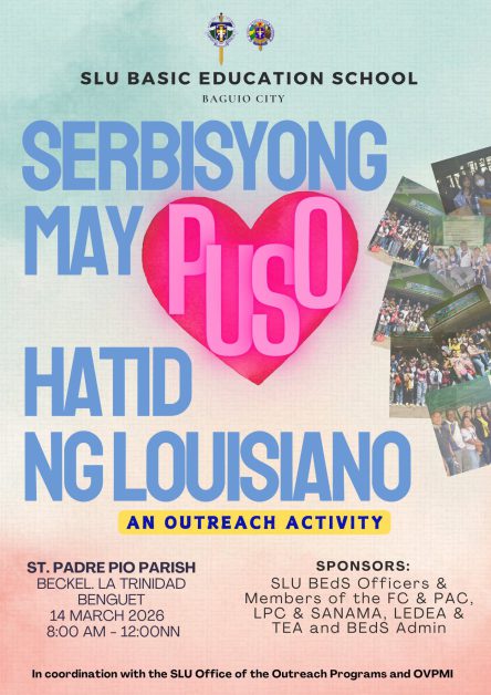 The Saint Louis University Basic Education School (SLU BEdS) associations of parents, teachers, and students carried out an outreach activity at St. Pedro Pio Parish in Bekkel, La Trinidad, on 14 March 2026. This initiative was initiated through Rev. Fr. Gilbert B. Sales, CICM, University President, who underscored it as a call to action for the Louisian community to actively engage in meaningful service and social responsibility, in close coordination with the University Outreach Programs Office (UOP).